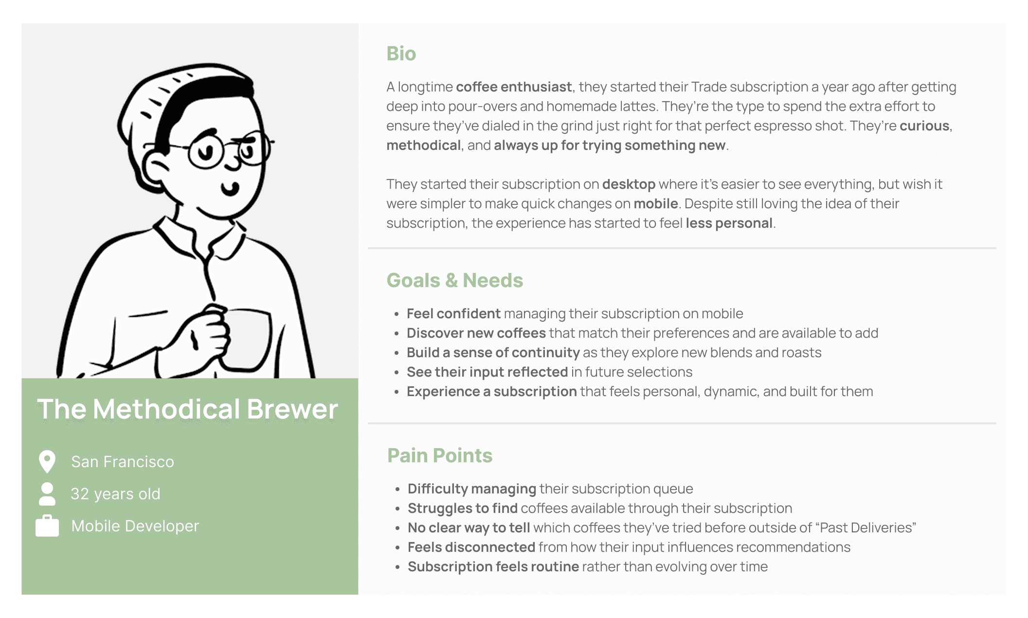 Together, these patterns reveal a platform that delivers premium coffee, but struggles to deliver a premium experience. These gaps became especially clear when viewed through the lens of our primary user.