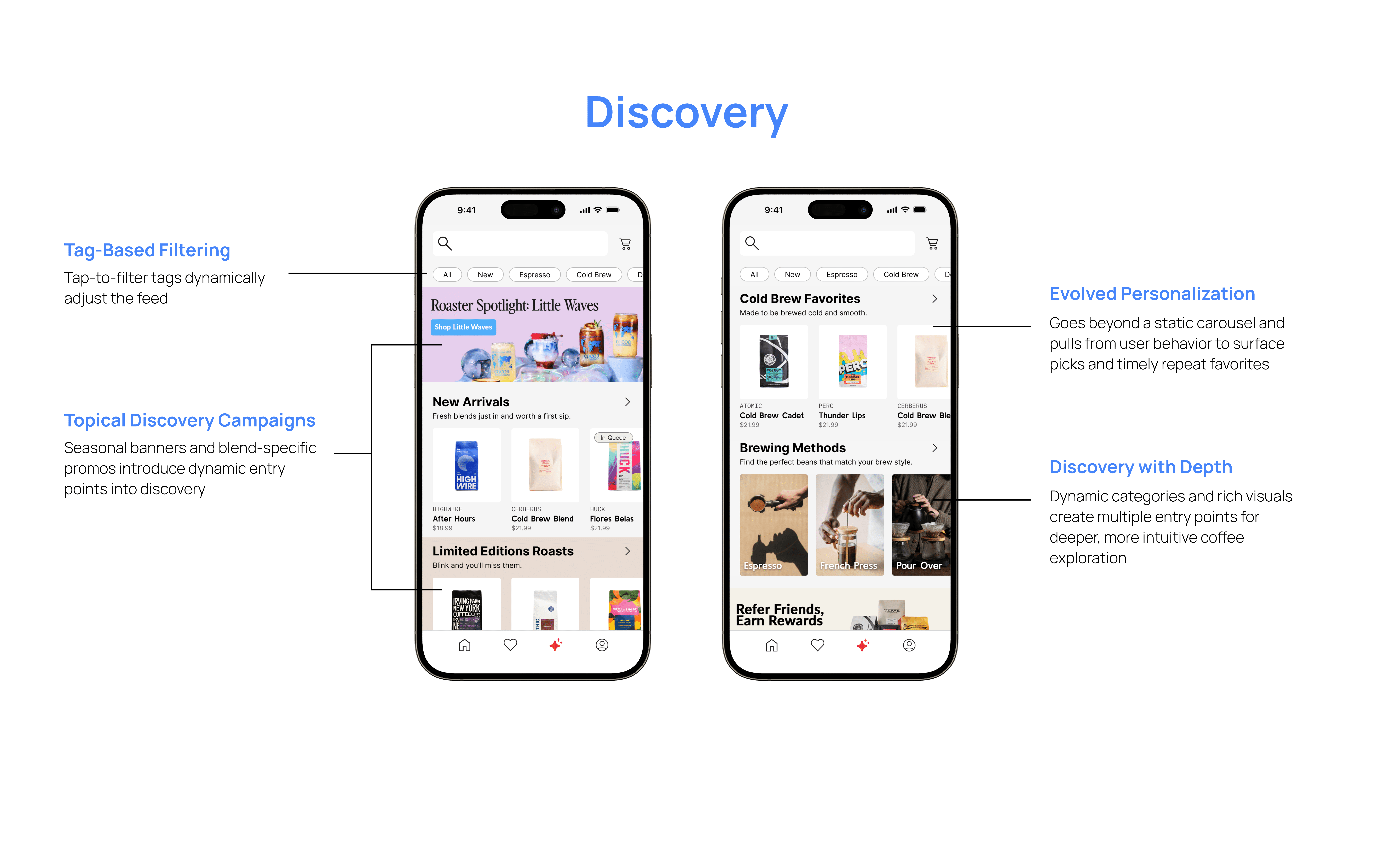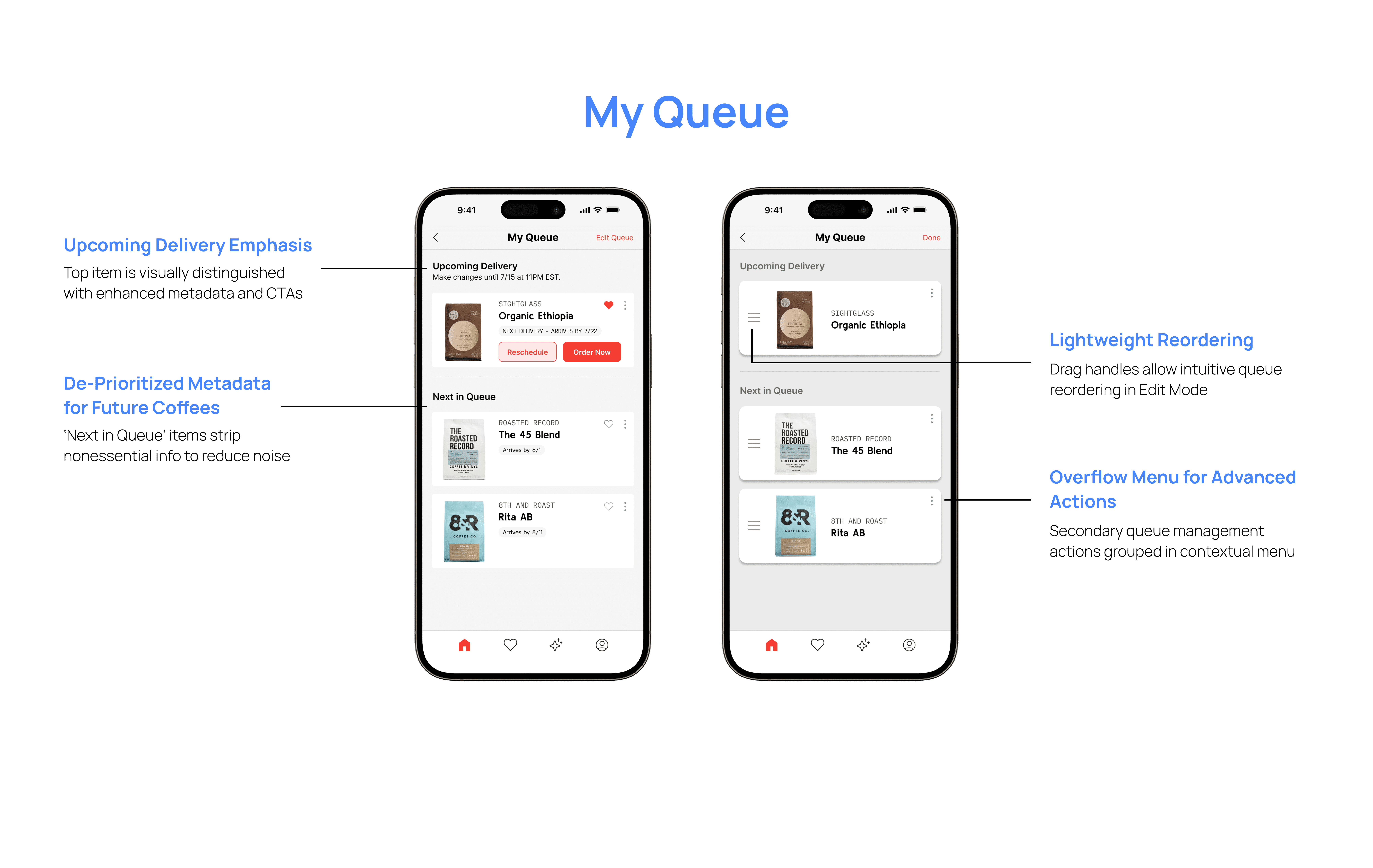 I charted four core user flows—editing the queue, rating past coffees, browsing favorites, and discovering new blends—to surface the moments most prone to user friction and guide the mobile app design.