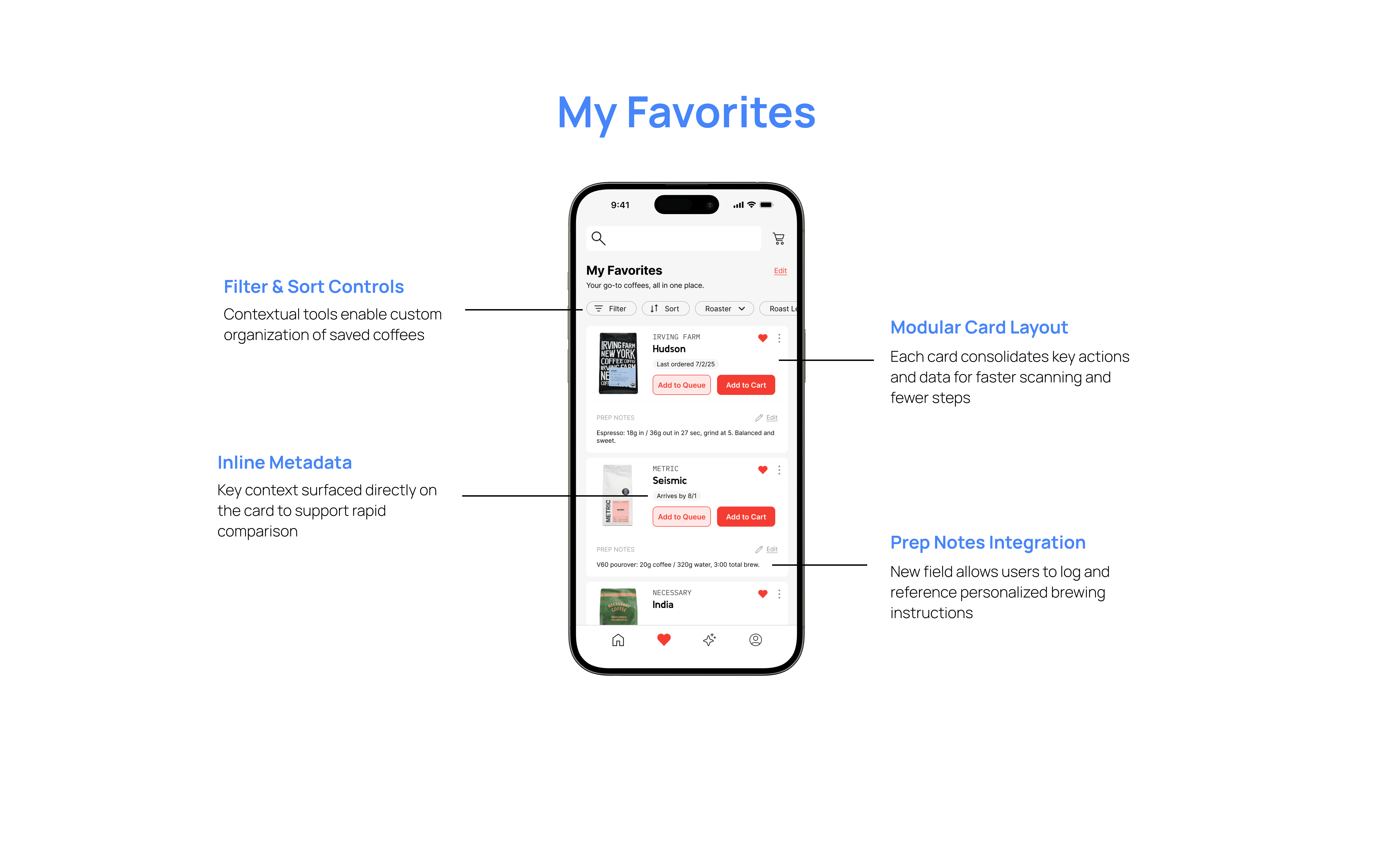 Make Favorites a brew companion with prep notes, last ordered date, and one-tap reordering.