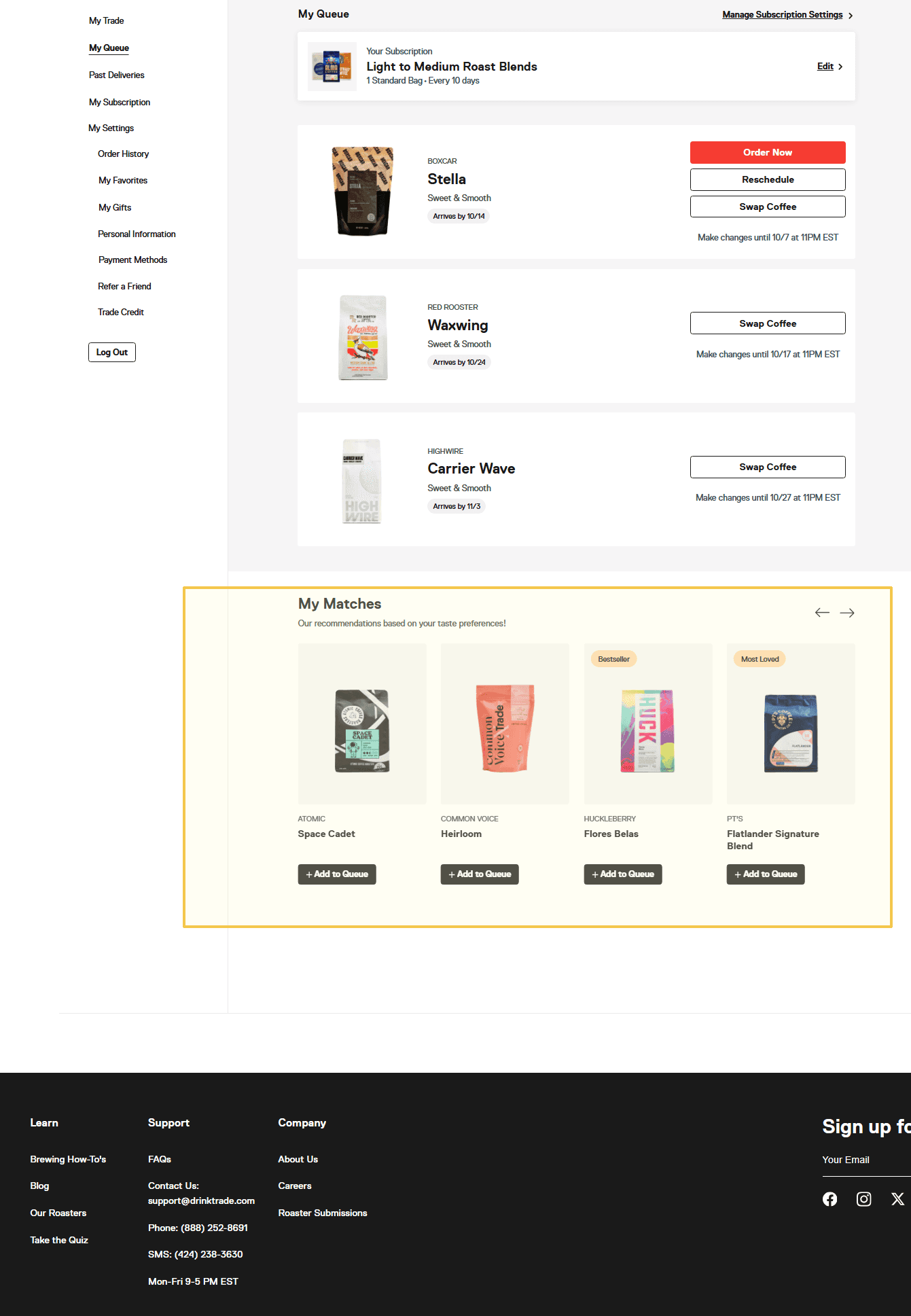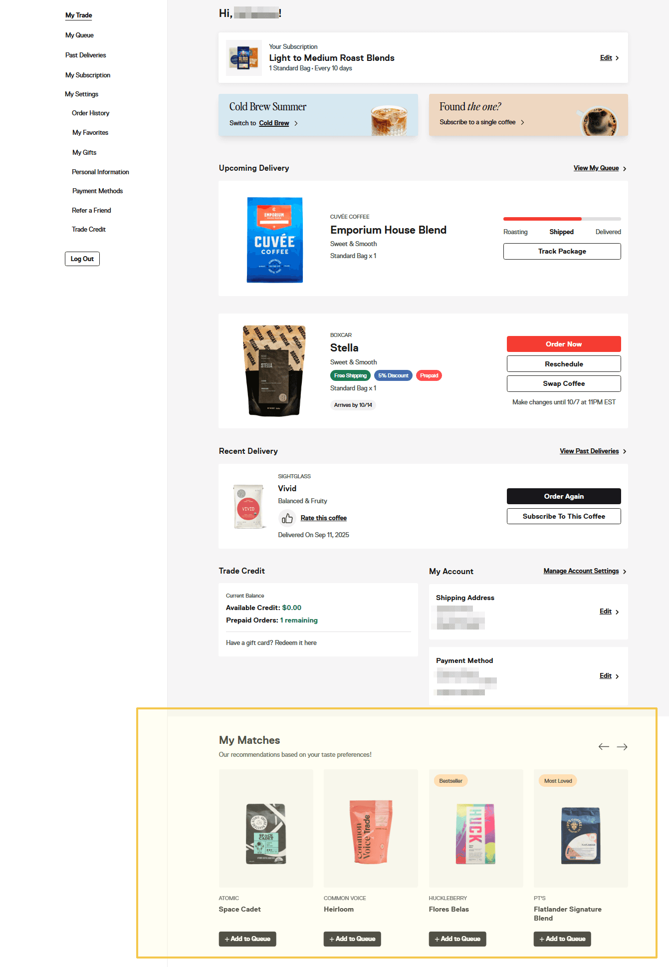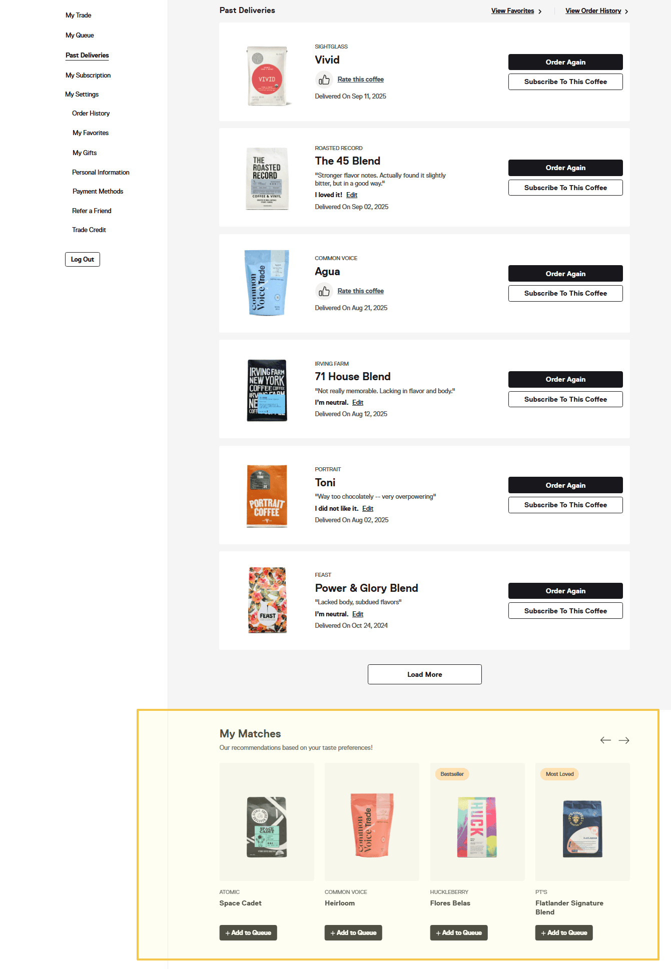 Users can technically browse subscription coffees, but only through indirect or buried paths. The My Matches carousel sits below the queue, repeats across four sections (My Trade, My Queue, My Subscription, Past Deliveries), and still fails to show the full offering (Figure 2.1). If discovery is the draw, why is it so hard to find?