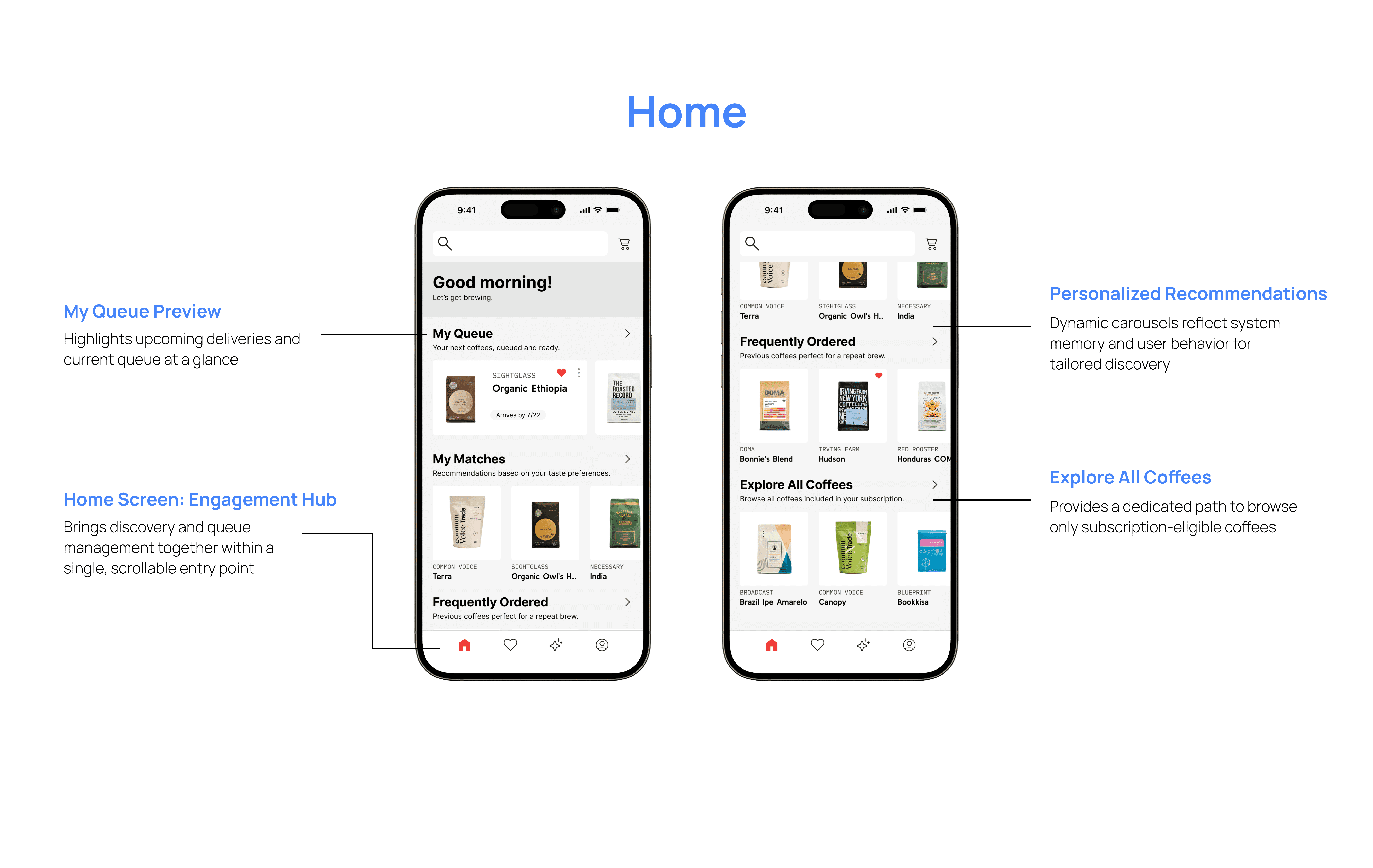 Figure 2.1. The My Matches carousel is repeated across four separate pages buried below content like Past Deliveries, Payment Methods, and Account Settings, making coffee discovery feel fragmented and redundant.